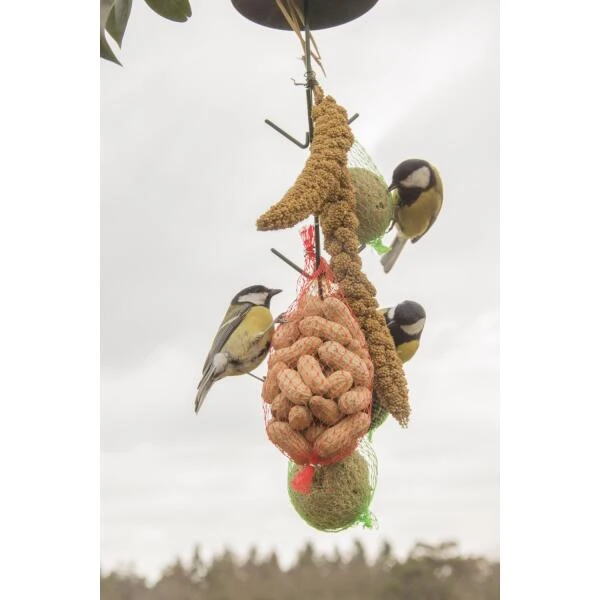 Aan deze donkergroene voederhaak kan je verschillende soorten vogelvoer hangen. Er zijn in totaal negen haken aanwezig. Je kan dus tot negen verschillende netjes met vetbollen, pindanoten of ander vogelvoer ophangen voor de verschillende soorten vogels in je tuin.