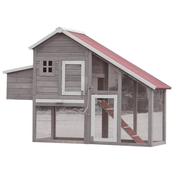 Het hok heeft een afsluitbare, volledig overdekte buitenren die onder het nachthok doorloopt. Het nachthok is bereikbaar via een loopplank en beschikt over een legnest. Dit nest is van buitenaf bereikbaar om de eieren te verzamelen. Zowel het volledige hok als het legnest zijn voorzien van een dak dat is afgewerkt met groen dakleer. Het nachthok heeft een mestlade, een deur en een raampje.
